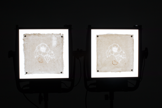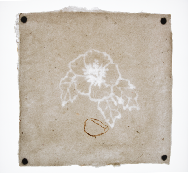 The Rose and the Rose of Sharon are both national flowers of the U.S. and South Korea. Through the use of watermark, the phrase "of sharon" is revealed when light passes through it. Likewise, a Rose of Sharon flower appears with light and is juxtaposed with a Rose seed.